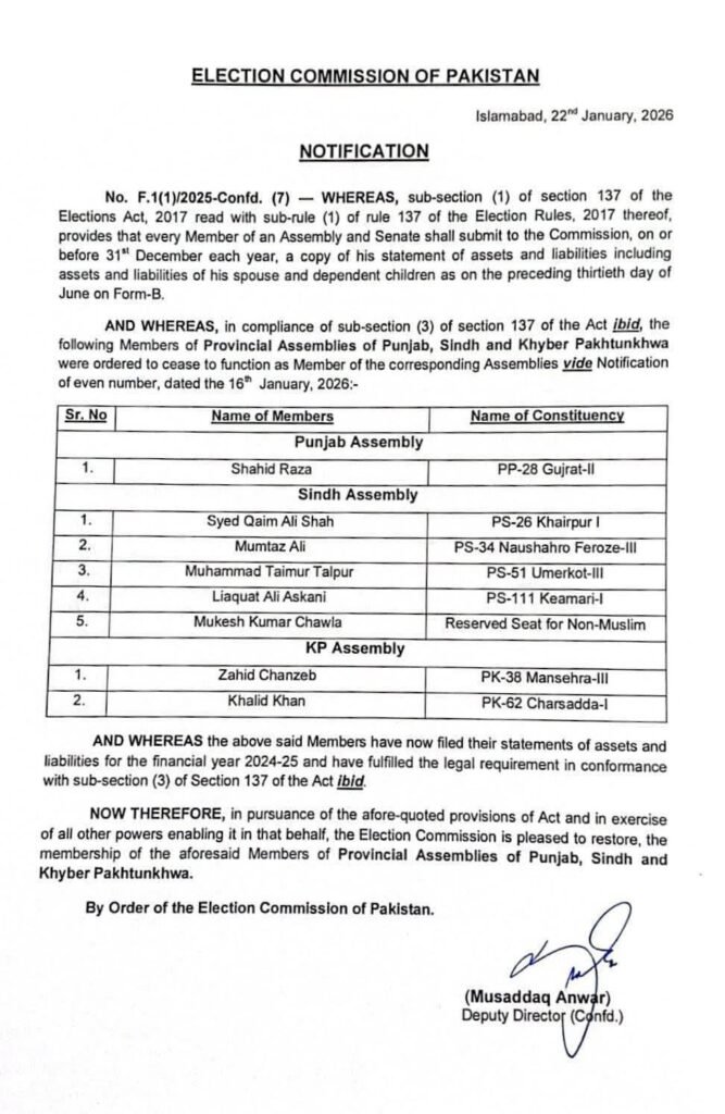 پاکستان تحریکِ انصاف کے رکنِ پنجاب اسمبلی چوہدری شاہد رضا کوٹلہ (ایم پی اے PP-28) کی پنجاب اسمبلی کی رکنیت باضابطہ طور پر بحال کر دی گئی ہے، جس کا باقاعدہ نوٹیفکیشن بھی جاری کر دیا گیا ہے۔ نوٹیفکیشن کے بعد وہ دوبارہ بطور رکنِ اسمبلی اپنی ذمہ داریاں سنبھالیں گے۔